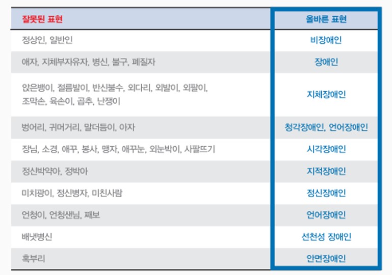 바른 용어 가이드라인 페이지에선 고쳐야 할 용어를 과거용어와 비하용어, 자제용어로 세분하였고 바른용어를 함께 제시하여 실천할 수 있도록 하고 있다. 눈에 띄는 점은 장애인 관련해서 일반인이란 용어도 자제용어에 포함되었다는 점이다. '비장애인이 일반인이면, 장애인은 비일반인인가'라는 관점에서 자제할 필요가 있다고 판단된다. 또한 과거에는 뇌 손상과 관련되어 발작을 반복적으로 일으킬 경우 간질이라는 용어를 사용했지만 뇌전증으로 변경되었으니 참고할 필요가 있다.